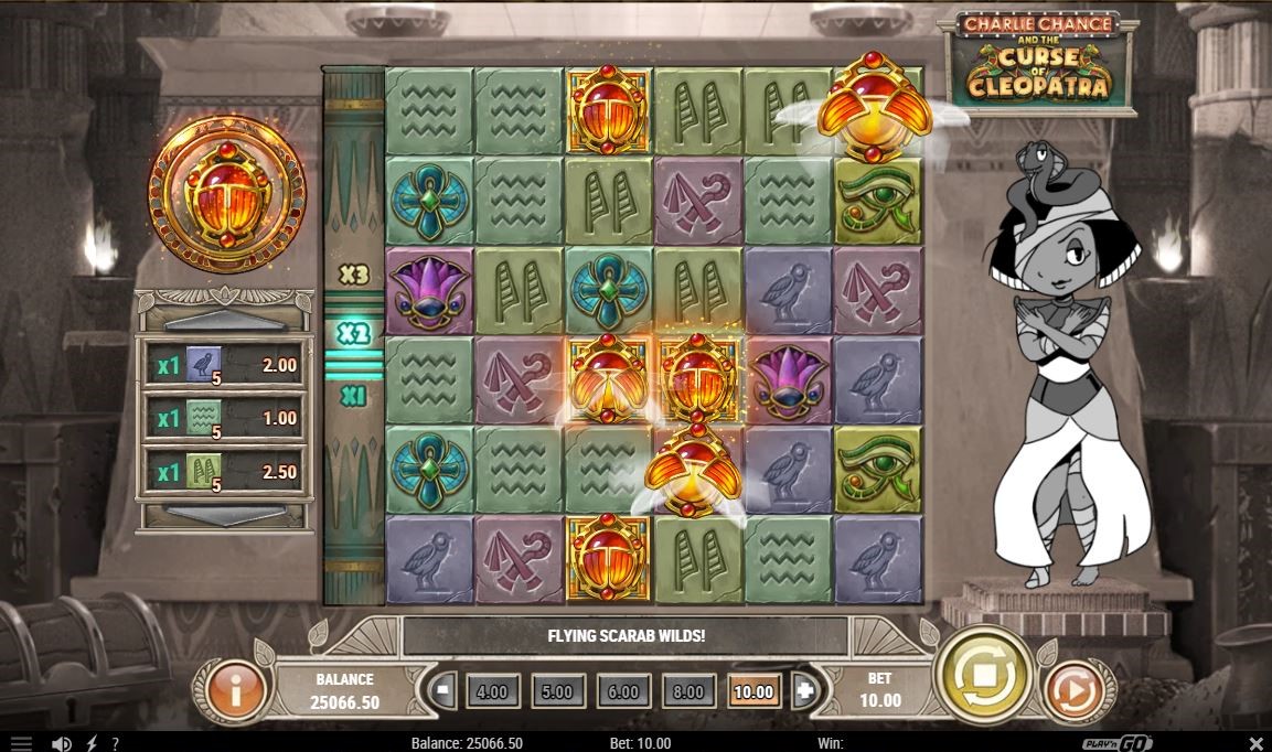 Open the game and help Charlie Chance find the treasures of Cleopatra. The slot machine has a 6×6 grid, on which you can trigger different special features. Wild and Scatter symbols do their job and give you extra money. But aside from Flying Scarab wild symbols that land on the reels on any random spin, you can activate Cleopatra’s Column Feature and Serpent’s Trail that boost your chances of winning.