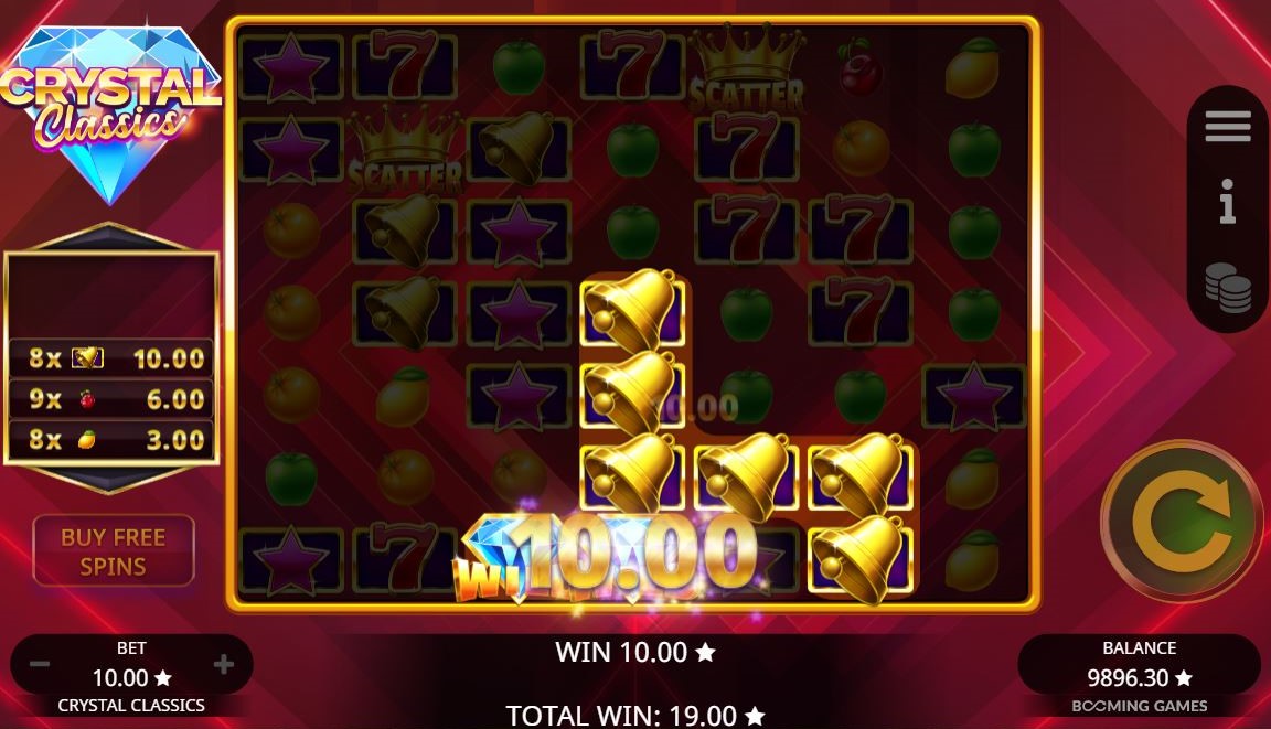 For all fans of classic slot machines, there is Crystal Classics. It’s themed with everything that you love — fruits, crystals, stars, and sevens. Find it at the best Booming Games online casinos: