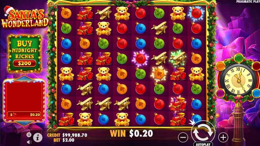 On the 8×8 game field, you need to hit five symbols connected vertically or horizontally. On the right side of the screen, there is a clock that helps you make more wins by releasing special features such as refresh, wild Santa, blocks, supersize, and lucky Santa. Midnight Riches, multipliers, and other specials will make your session feel like Christmas for real.