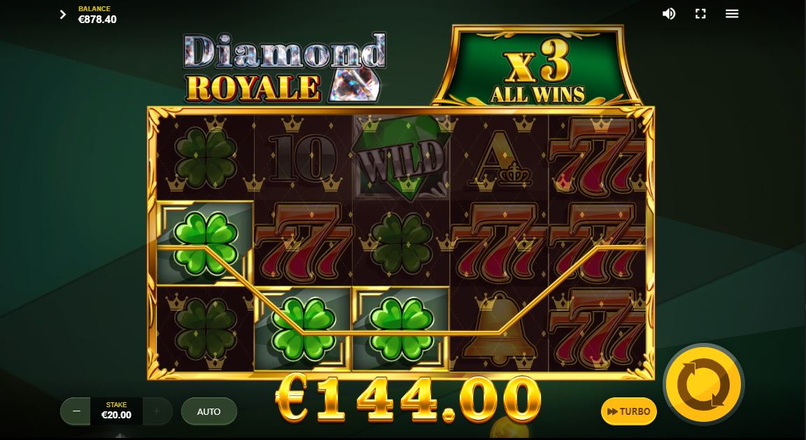 Diamond Royale features a global multiplier, wild symbols with multipliers, and a free spins game with a double wild symbol. As you can see, the main providers of good gameplay are numerous multipliers and wild symbols. But what else does a regular player need? The classic game offers a classic 5×3 grid with 10 paylines.