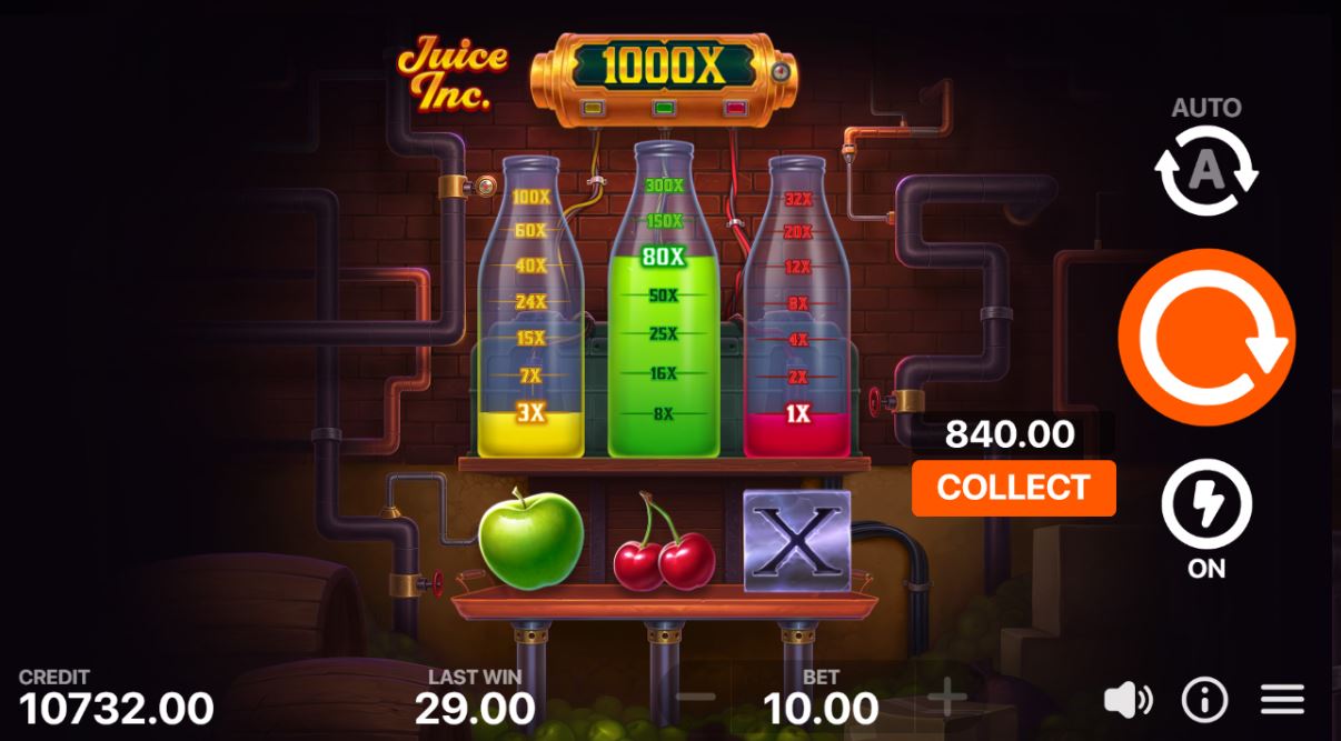 It’s a 1 row 3 reels slot that gives you a chance to fill in all three bottles with juice and win 1000x your bet! But be careful, don’t let the three X metal symbols land on the reels because they will reset all your earnings.