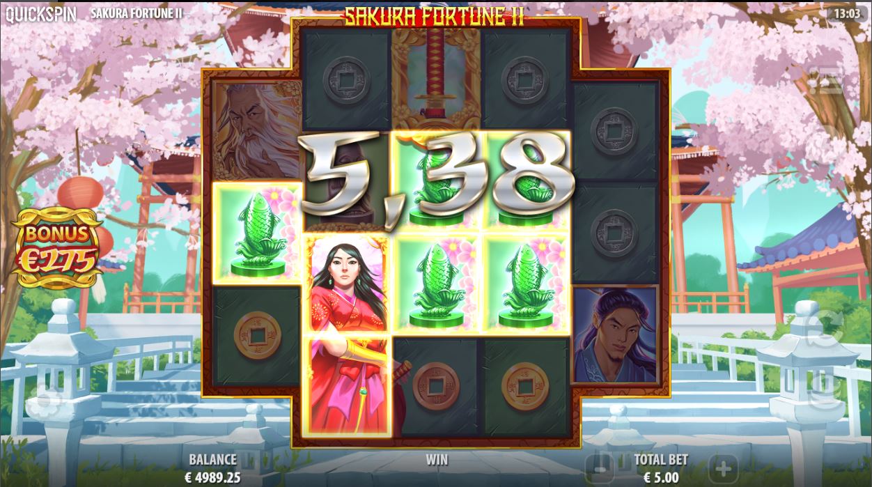 Every time you see a Sakura Wild drop on a reel, there’s a probability that the symbol nudges and covers the entire reel. It will reward you with one respin and lock in place for that additional spin.