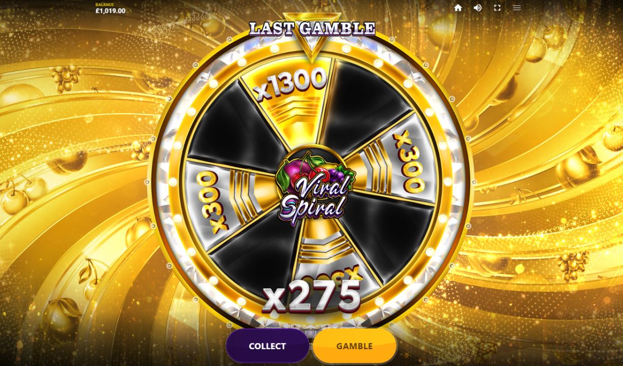 Viral Spiral is a 1-reel slot that opens the doors to the golden Bonus Wheel. It has 8 segments, four of them have a bet multiplier, and the other four are losing. If the pointer stops on one of the winning segments, you get a money prize. But this isn’t all. You have two options to follow: gamble or collect. If you choose to gamble, you can multiply your win by up to x5,000!