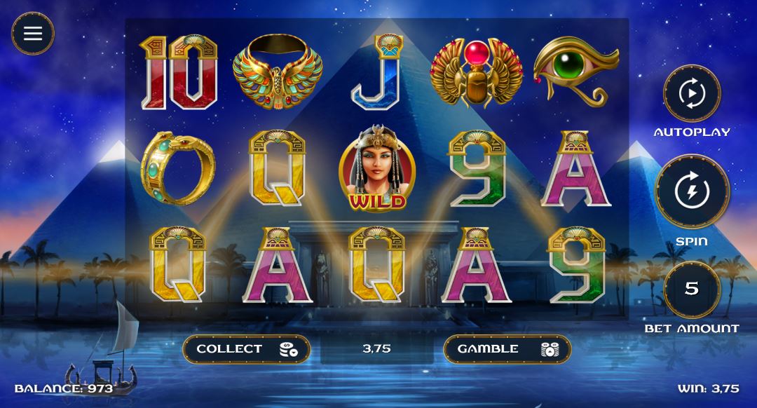 The slot has a bonus round with free spins that can be retriggered up to 180 free spins. The game features one more extraordinary feature called Double Up. It’s a gamble game that you can play after each win. When you open it, Cleopatra appears on the main screen holding two lotus flowers in her hands. You need to pick one of them. If the selected flower contains gold coins, you receive a double win and a chance to see Cleo taking off one piece of her clothes. Win 5 times in a row during the gamble feature and leave her topless.