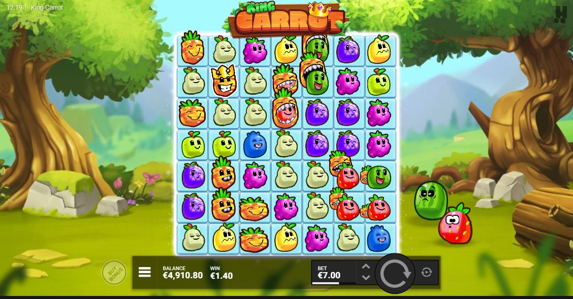 King Carrot is a cluster pays type of slot, which means cluster combinations of symbols count as winning. The maximum win potential of this vegetable-themed slot is x10,000. It has several special features that add up multipliers to your win.