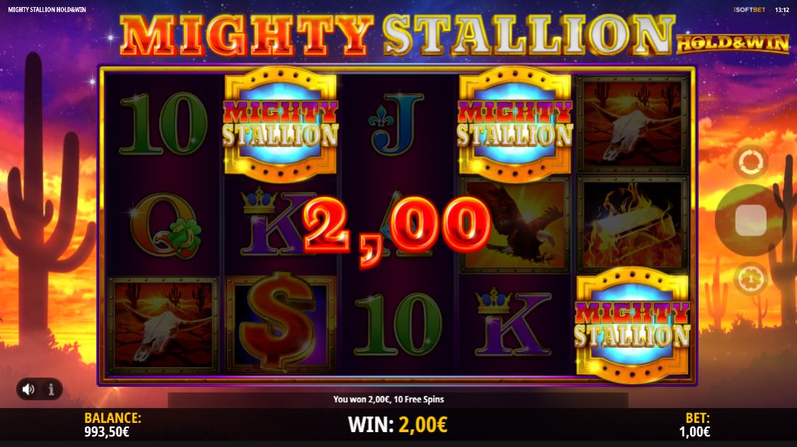 Mighty Stallion has two bonus games, free spins with Hold & Win respins and spins with Mighty Stallion Wilds. Both reward players with 10 free spins and multipliers.