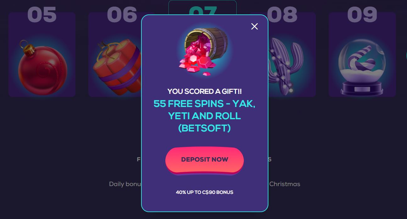 The Gift Calendar includes “Infinity” bonuses that can be claimed multiple times a day. Each bonus offer can be activated by a minimum deposit of CA$30. Make sure to use the bonus within 3 days until it expires.