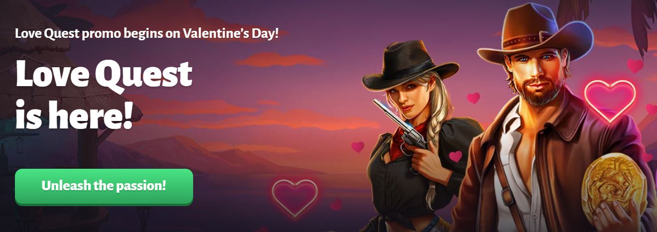 The last day of Love Quest is the most mysterious. On February 20, you can pick only one bonus code and see what it hides behind. When making a deposit of at least 50 EUR, you need to enter MYSTERY1, MYSTERY2, or MYSTERY3 into the promo code field and get your surprise gift.